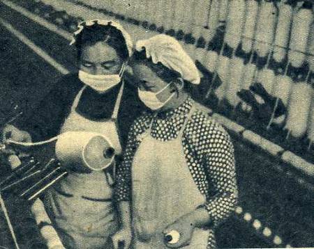 国营上海第十棉纺织厂整经间女工在爱国增产的号召下,都专心地在经纱车上工作,随时注意拆出错支纱头和油纱,使次布减少。