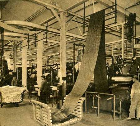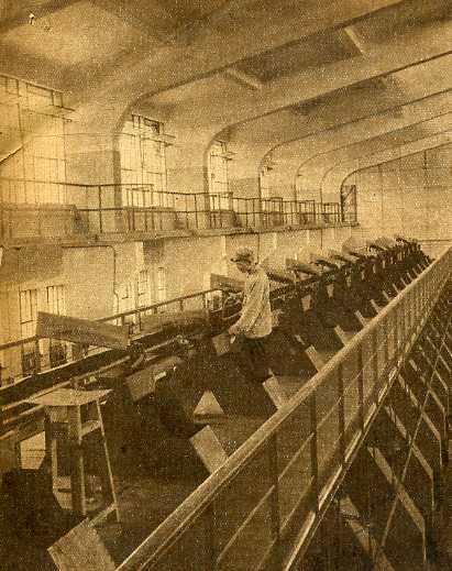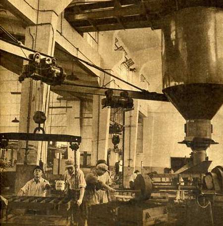 铸造车间。楼上的皮带送砂机自动将砂送至各造型机上,全机只需一个操纵。