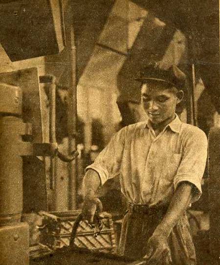 工人杨藻良已经能熟练地使用自动造型机了。他每工做砂360箱,最快时每分钟做一箱。