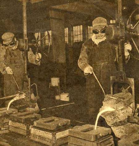 盛铁桶自动滑行至砂模运送车间。工人张广波、徐志熹正在将铁水铸入砂模中。
