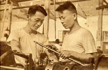 朱培先(左)被介绍到国营上海第二纺织机械制造厂做车床工。
