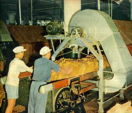 上海烟草公司的工人们正把成包的烟叶送入真空调节回潮机,利用机器的真空作用排除烟叶的异味,并杀灭其中的微生菌,以保证吸烟者的健康。