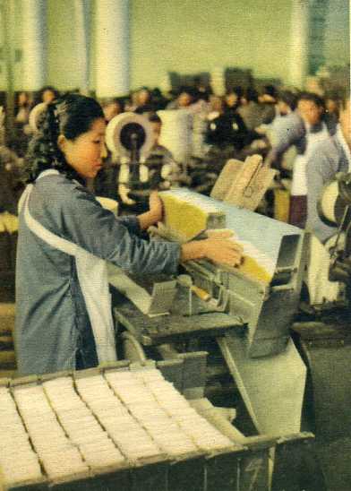 上海烟草公司包装车间的工人正在熟练地工作着,把制成的纸烟用机器迅速完密地包装起来,以备分运国内外各地,供应广大人民享用。