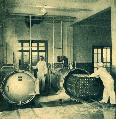 把大量的肉品罐头放进杀菌锅里去,经过一定的高温杀除罐内的细菌。
