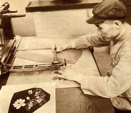 国营上海第一印染厂熟练的刻印员张凤翔正用机器雕刻4套色民族风格的鸳鸯花样。
