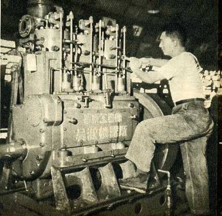 上海柴油机厂主要生产柴油机,也生产选矿机、打桩机等。这是一台即将完成的柴油机。