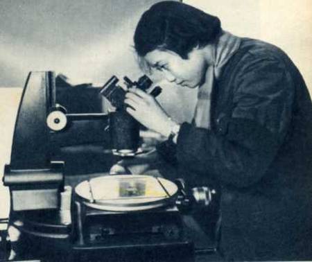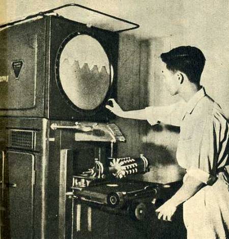 厂里生产的机床,精密度有的不能相差千分之五米厘(mm)。工作人员正在用工具显微镜检验新制成的机器零件。