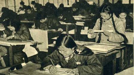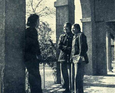 王英美(中)和同学们在校园里谈论她所喜爱的读物。她原是上海丽新纱厂的工人,而且8岁起就进纱厂当徒工人。