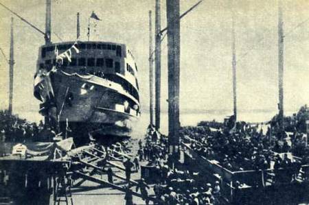 江南造船厂用国产材料制造的客轮“民众号”,已于3月20日举行下水典礼。这艘轮船是由公私合营民生轮船公司设计的,有4层舱房,974个舱位(睡铺),并可同时载运货物450吨。船身有95%以上是用电焊焊接,因而轻巧坚固,可以溯长江直航重庆。