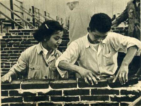 在暑期的生产实习中,工业和民用结构专业的学生们到工地上实习苏长有先进砌砖工作法。