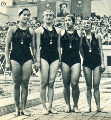 女子4x50米自由泳接力第一名上海队。从左到右:潘家珍、董琍、黄莲华、赵溱。