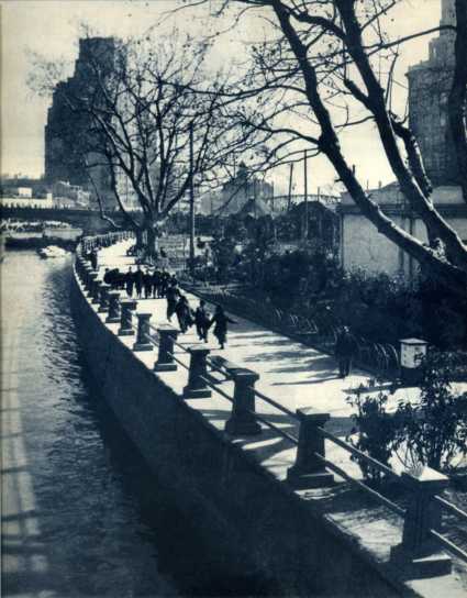 上海市苏州河原是一条污秽的水道,经人民政府整修后,河滨一带已经成为行人休息的场所。