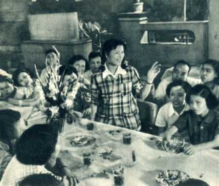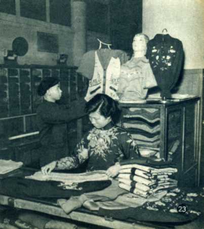 郊区虹桥村的农民李梅仙(右第二人)的儿子快要结婚了,她特地来买了两条绸被面和许多其他的东西,准备回去办喜事。