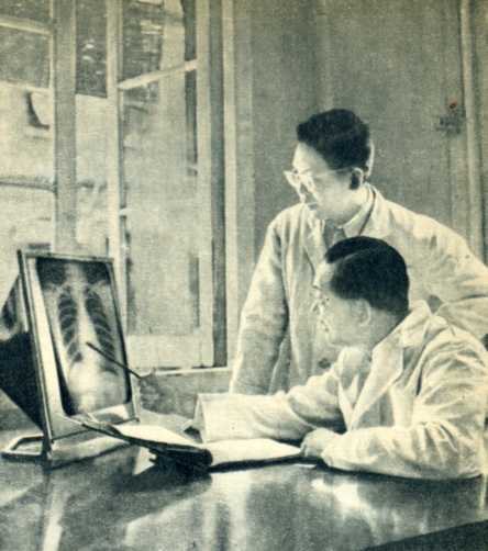 上海第二医学院教授兰锡纯(坐者)和讲师冯草荣在看爱克斯光片,确定施行心脏手术的部位。