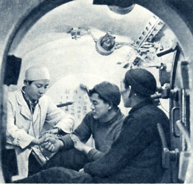 在打捞工作船上,装备有潜水减压箱等安全保健设备,并有随船工作的医务人员。