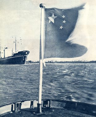 黄浦江上汽笛声声,各种船只往来如梭,停靠在浦西码头的英国怡和公司“东韵”号轮船冉冉地升起了一面红白旗,这表示中国引水员已经登船,船就要起碇了。