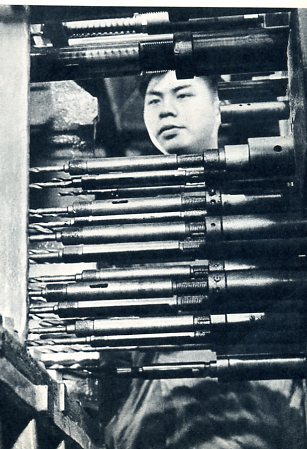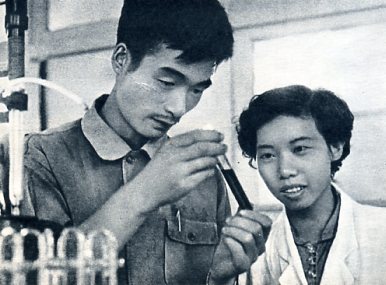 大批新的技术力量成长起来,这是工人出身的工程师吴顺祥(左)正设法提高柴油质量。