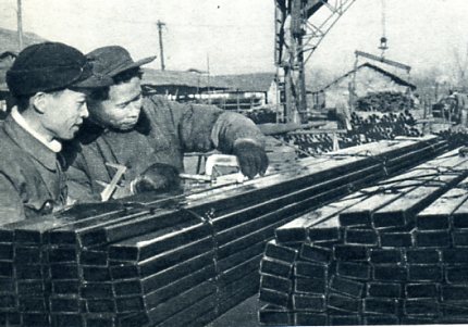 上海永鑫无缝钢管厂为适应生产拖拉机和联合收割机的需要,最近轧制出一批技术要求较高的矩形、方形、椭圆形等各种无缝钢管。这是职工在检查一批将要出厂的矩形无缝钢管。
