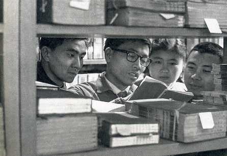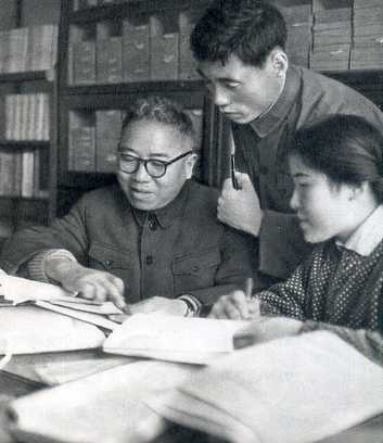 历史系学生与杨宽教授共同讨论法家人物的著作。