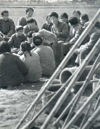 国际政治系的学生在上海马桥公社俞溏大队开门办学,与贫下中农在田头讨论国际形势。