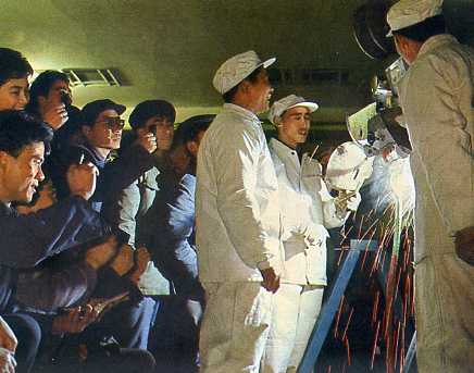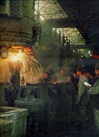 上海第五钢铁厂是我国冶金战线学大庆的先进企业之一,工厂领导干部(右)在炼钢炉前和工人一起劳动。
