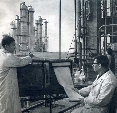 党支部书记任锡康(右),以大庆“铁人”王进喜为榜样,和工人们一起战斗在生产第一线上。