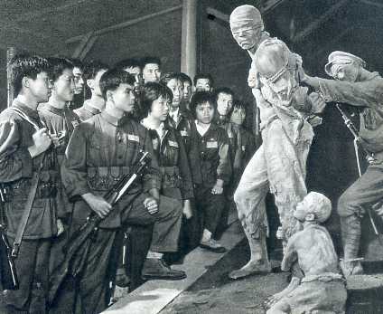 上海各级党组织经常对民兵进行阶级斗争和路线斗争教育。这是上海铁路局民兵在参观反映劳动人民解放前受压迫和剥削的泥塑《收租院》。