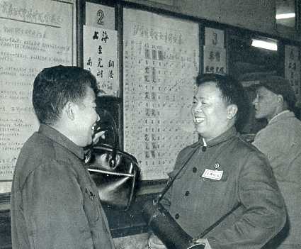 上海金陵东路火车售票处民兵王礼锠(中),在和旅客谈心,帮助旅客解决途中困难。
