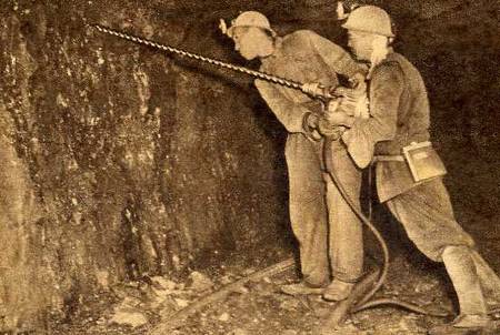 马六孩(左)和组里的一位工人正在打眼。马六孩领导的小组首先采用了“多孔道挖掘进循环作业法”,提高掘进效率一倍左右,创造了全国掘进的新纪录。