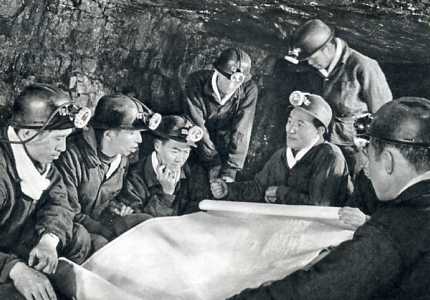 工人、干部、技术人员在制定煤矿的生产规划中,深入井下调查研究。