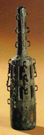 (商)钲。钲是古代一种在行军时敲打的铜制打击乐器。该钲形制特异,工艺精美,通体镂空。上附多枚铜环,摇动钲体可发出清脆的钲声。