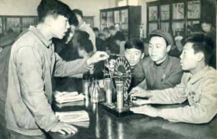 老工人田锦高(左)在指导青年工人操作。在试制新产品中他改进了80多种工具。