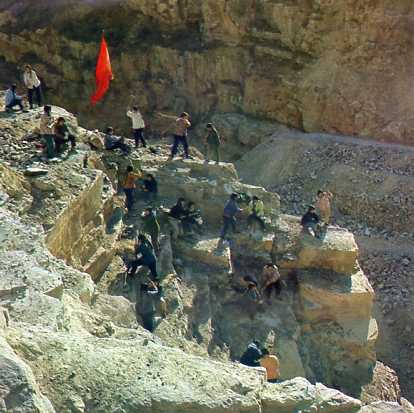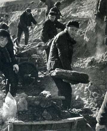 南关大队社员正在修建保水、保土、保肥的水平梯田。
