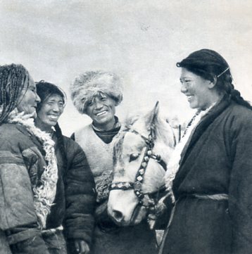 特区的干部经常深入牧场和帐篷,领导生产。这是贫苦牧民出身的副区长索郎卓玛(右一)在和牧民谈话。