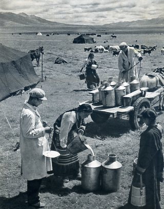 为了适应畜牧业发展的需要,当雄特区设立了奶粉厂。图为奶粉厂向牧民收购牛奶。
