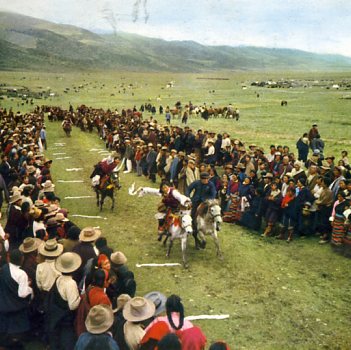 牧民们在赛马大会表演传统节目“拾哈达”。
