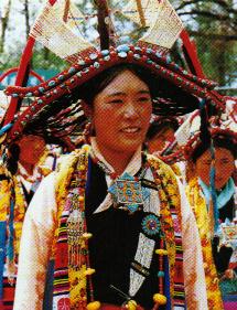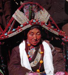 妇女服饰。头戴“巴廓”,胸饰“噶吾”。