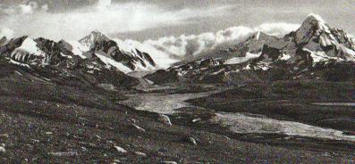 雅鲁藏布江的两条河源在桑木桑汇合,桑木桑位于仲巴县的西部。南面的一条叫库比曲,北面的一条叫杰马央宗曲。这是库比曲的发源地—阿布斯加布隆冰川。(1976年)