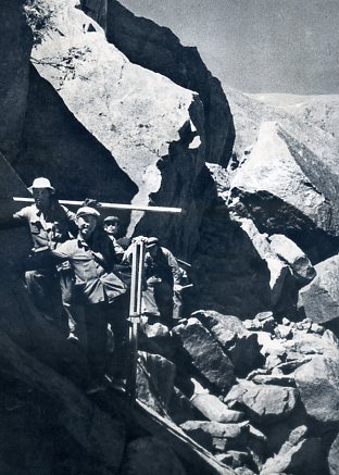 雅鲁藏布江是西藏高原最大的河流,有许多峻谷适宜修建巨型电站。这是考察队员在攀登峭壁,收集有关科学资料。