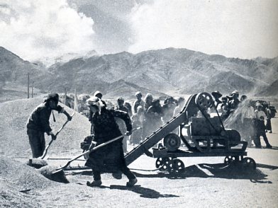 西藏自治区的国营澎波农场藏族工人正在使用扬场机扬青稞。这些农奴出身的藏族工人,现在已经掌握了不少较先进的农业生产技术。在他们当农奴的时代,脱粒时,只会使用梿枷敲打或用牛蹄踩踏。