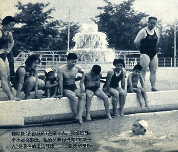 穆祥雄(在游泳的)全家十人,除妈妈外,个个都会游泳。他的父亲穆成宽(右第一人)是著名的游泳教练。