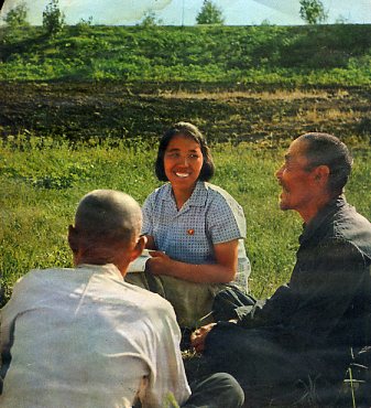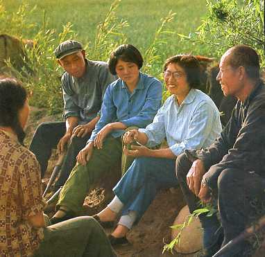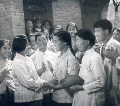 在小靳庄姑娘们坚决不收彩礼的新风影响下,王卜庄公社女青年郝振敏(左二)来小靳庄退彩礼,受到了社员群众的赞扬。