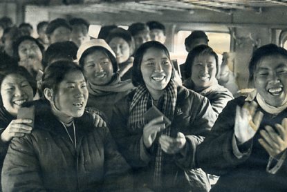 邢燕子(右三)参加庆祝河北省革命委员会成立大会时,在火车上宣传毛泽东思想。