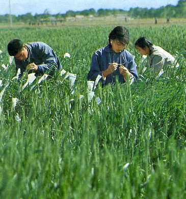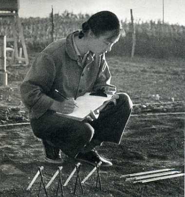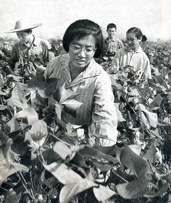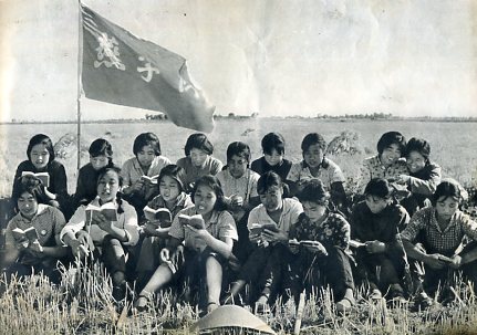 “燕子队”已成为司家庄大队生产上的一支突击力量。这是她们在劳动休息时学习革命宝书《毛主席语录》。