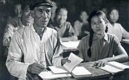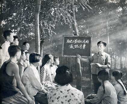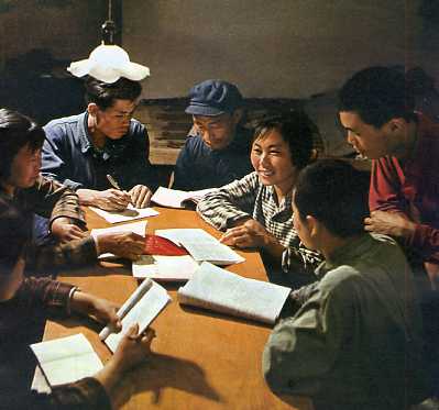 知识青年和社员在政治夜校学习无产阶级专政的理论。