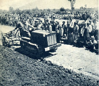 喀什“八一”拖拉机站在为农业社耕地,这个拖拉机站是由人民解放军捐款建立的。