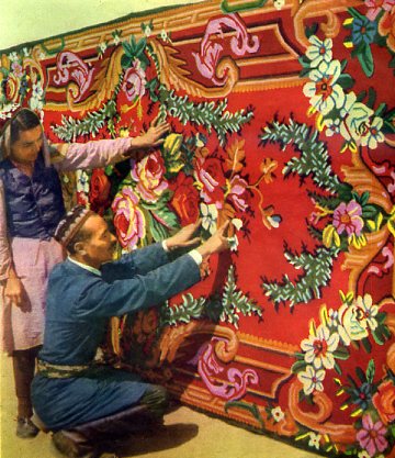 和阗地毯自古名闻远近,这是和阗地毯厂工人买迈提肉孜夫妇新织的花毯。