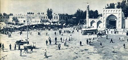喀什市的中心广场。右面的高大建筑是新疆最大的艾提卡尔清真寺,最近已修整一新。