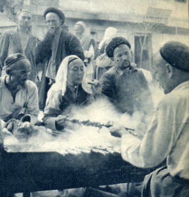 维吾尔人喜欢吃烤羊肉,肉摊随处可见。