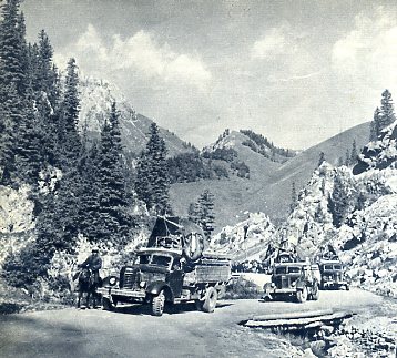 行驶在天山的载重车队。图中第一辆汽车的驾驶者苏长福,从1951年起没有发生过一次事故,安全行驶了38万公里以上无大修。